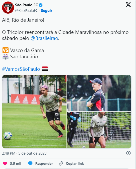 Já o São Paulo, que acaba de conquistar o título da Copa do Brasil (o que lhe garantiu uma vaga na edição 2024 da Libertadores), está na 10ª posição da tabela com 34 pontos. A equipe comandada pelo técnico Dorival Júnior também chega em um momento positivo no Brasileiro, após bater o Corinthians por 2 a 1 no último final de semana no Morumbi.