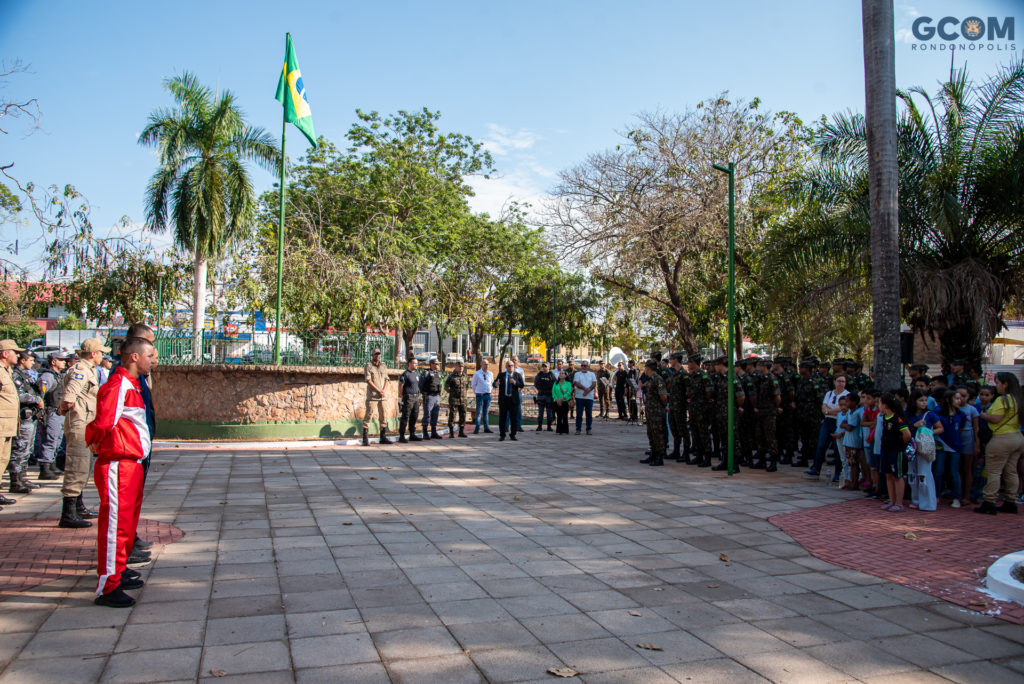 Populares que passavam pela Praça Brasil nesta manhã e alunos da Escola Estadual Militar Tiradentes Major PM Ernestino Verissimo da Silva e Escola Municipal Dom Wunibaldo Talleur acompanharam o ato de abertura da Semana da Pátria em Rondonópolis.