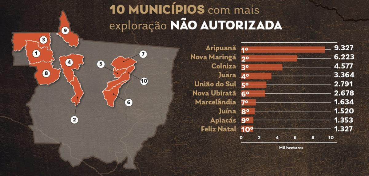 A cidade que mais presenciou a exploração ilegal foi Aripuanã, (1.002 km ao Norte de Cuiabá) que, sozinha, foi responsável por 19,4% dos 48 mil hectares explorados. A lista com os campeões na ilegalidade é seguida por Nova Maringá (12,9%), Colniza (9,5%) e Juara (9,5%) (400 km, 1065 km e 709 km de Cuiabá). Os demais municípios podem ser vistos no gráfico abaixo.